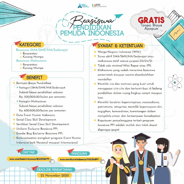 Event Hunter Indonesia membuka kesempatan bagi generasi muda tanah air khususnya pelajar di tingkat SMA/sederajat dan pelajar di tingkat perguruan tinggi melalui Beasiswa Pendidikan Pemuda Indonesia (PPI) tahun 2020.